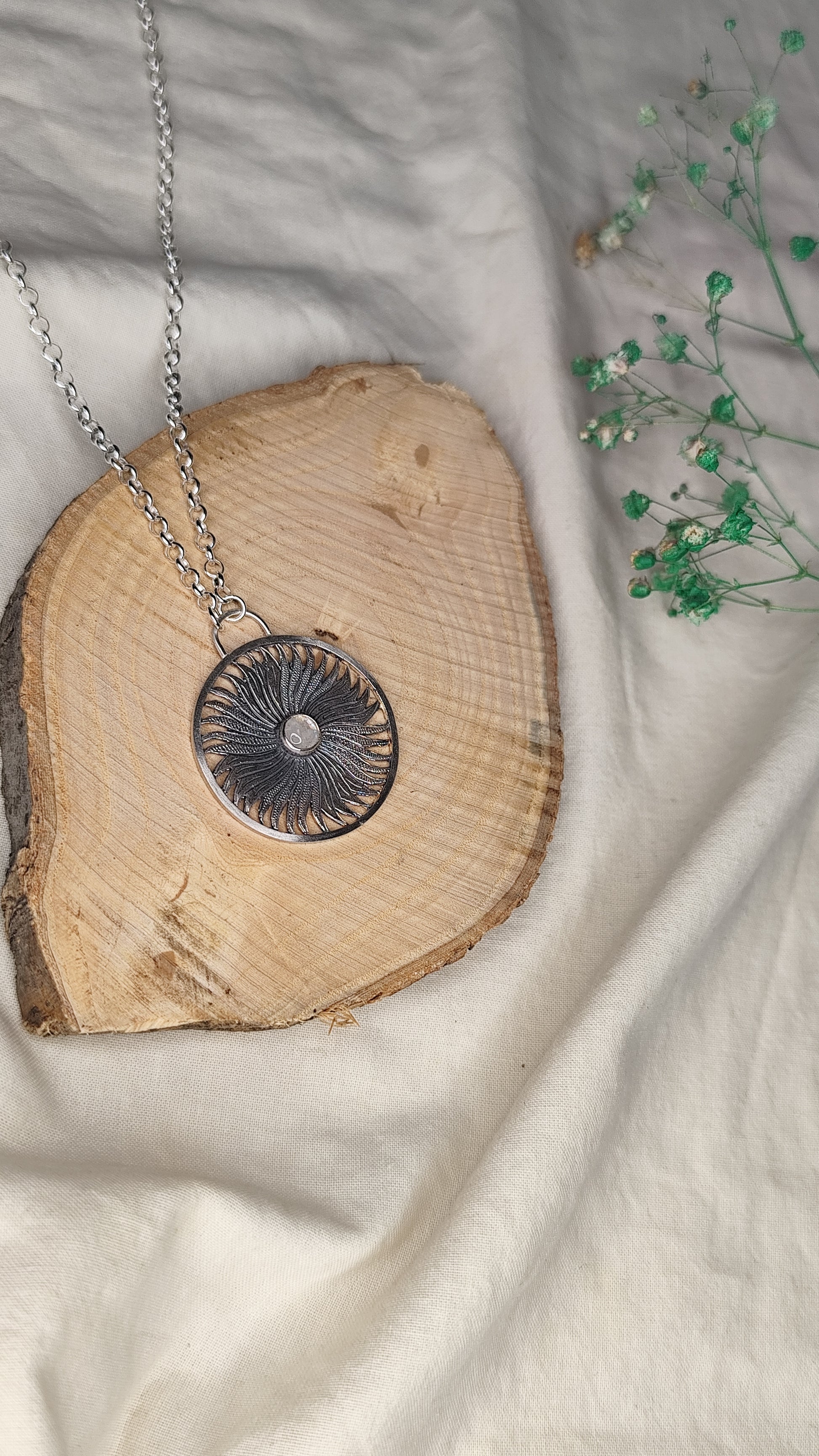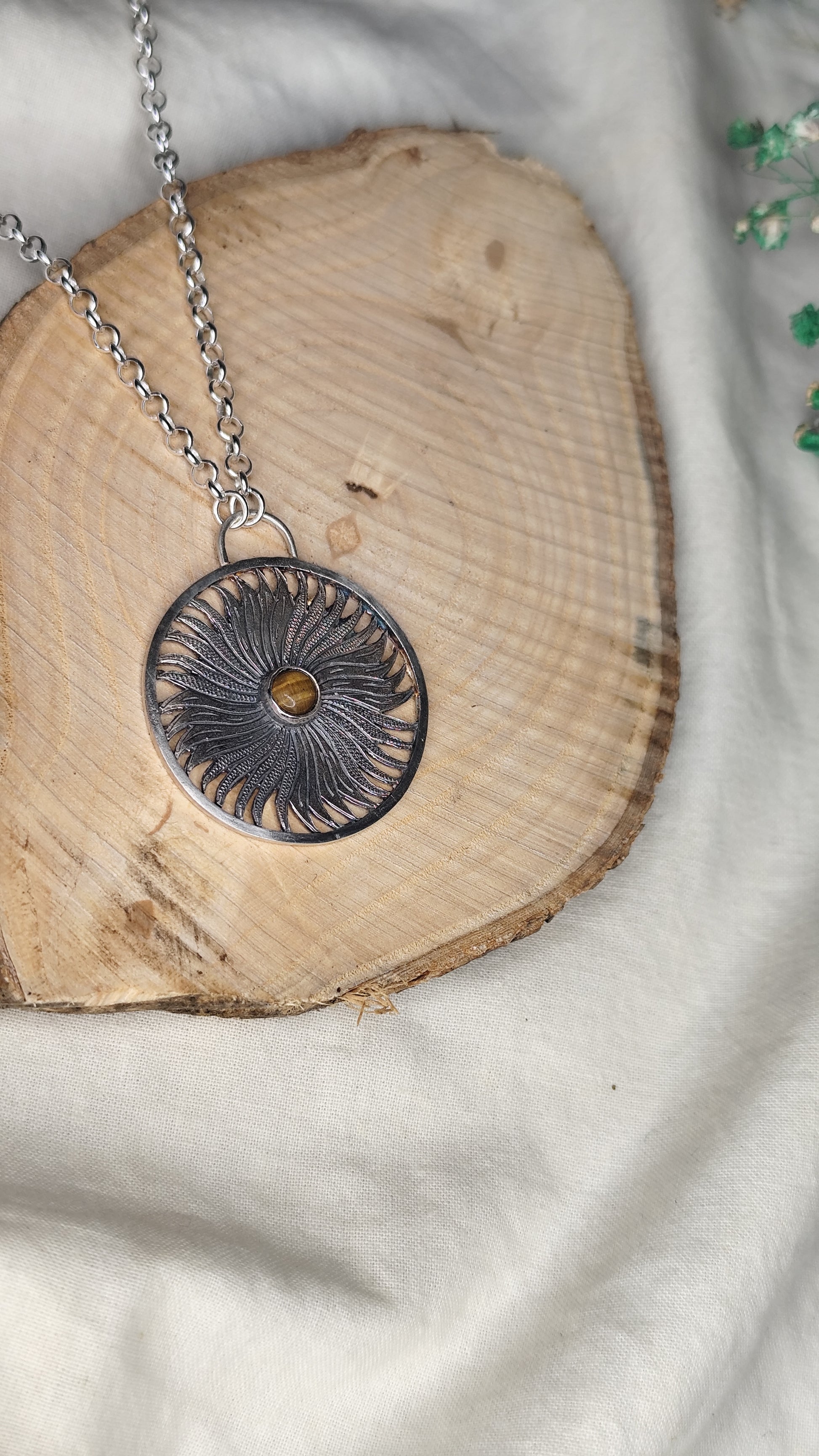 En su corazón, una gema natural irradia su energía vital, evocando la calidez del sol, la intuición de la luna o la profundidad de las piedras ancestrales.