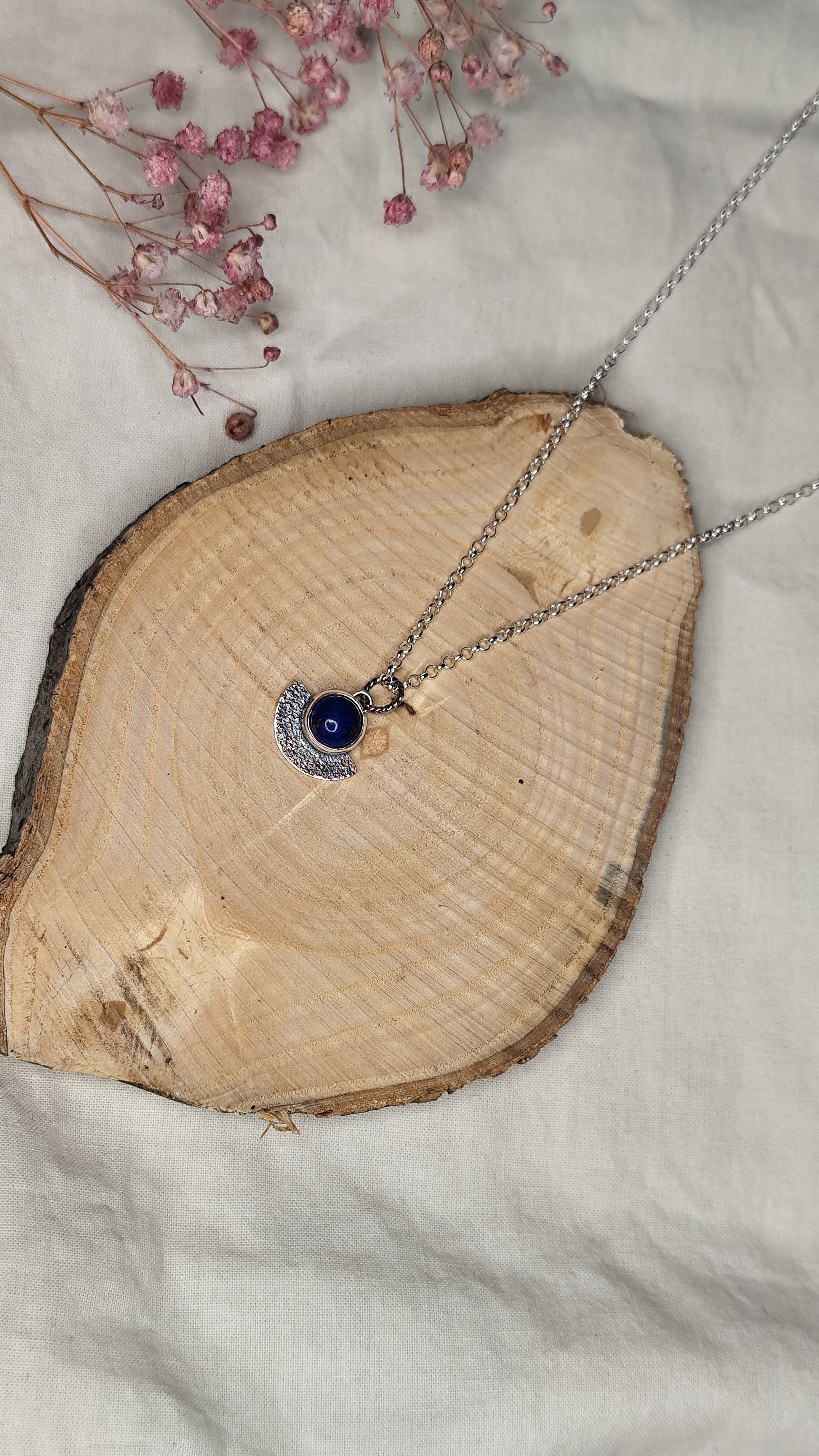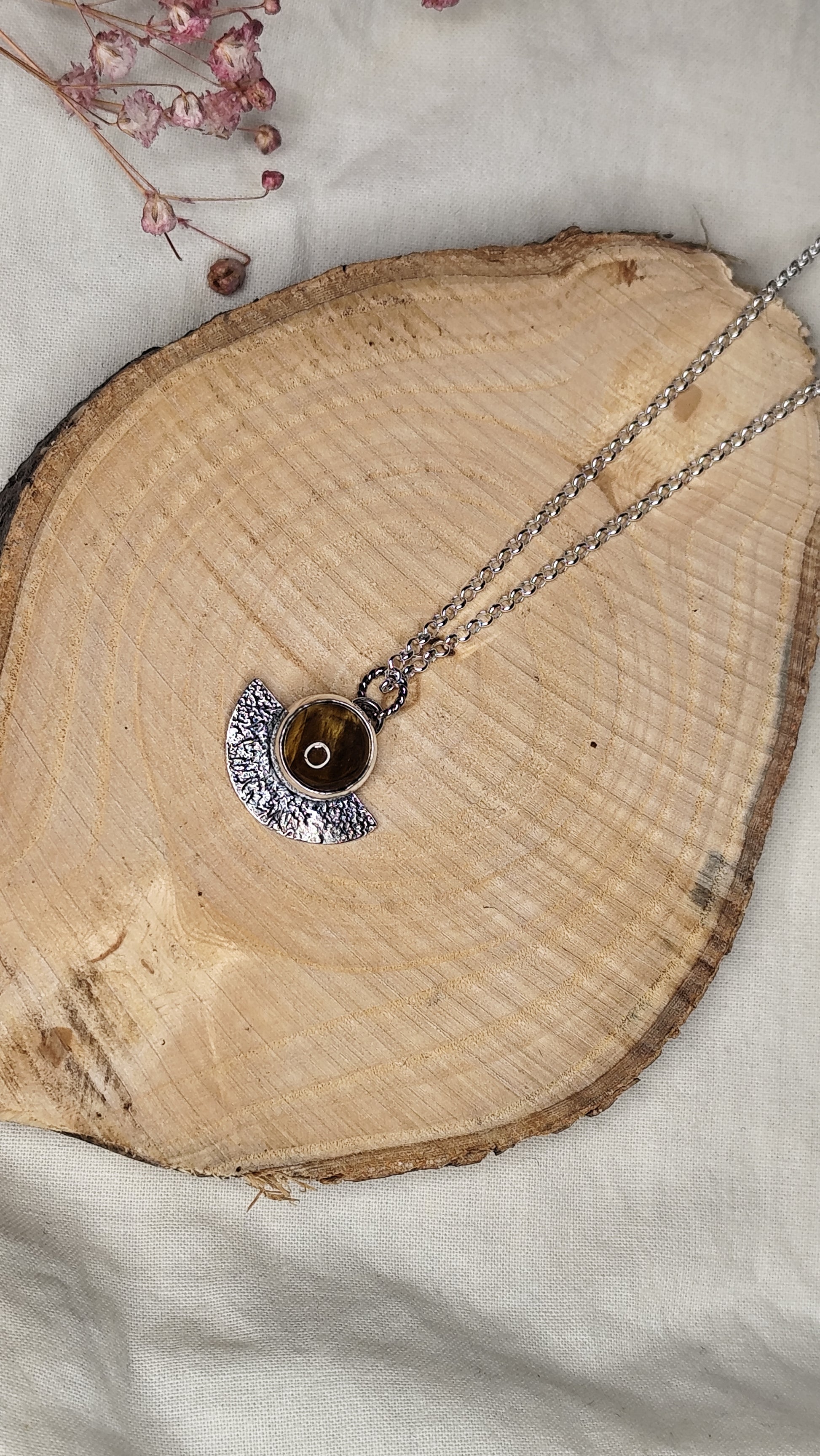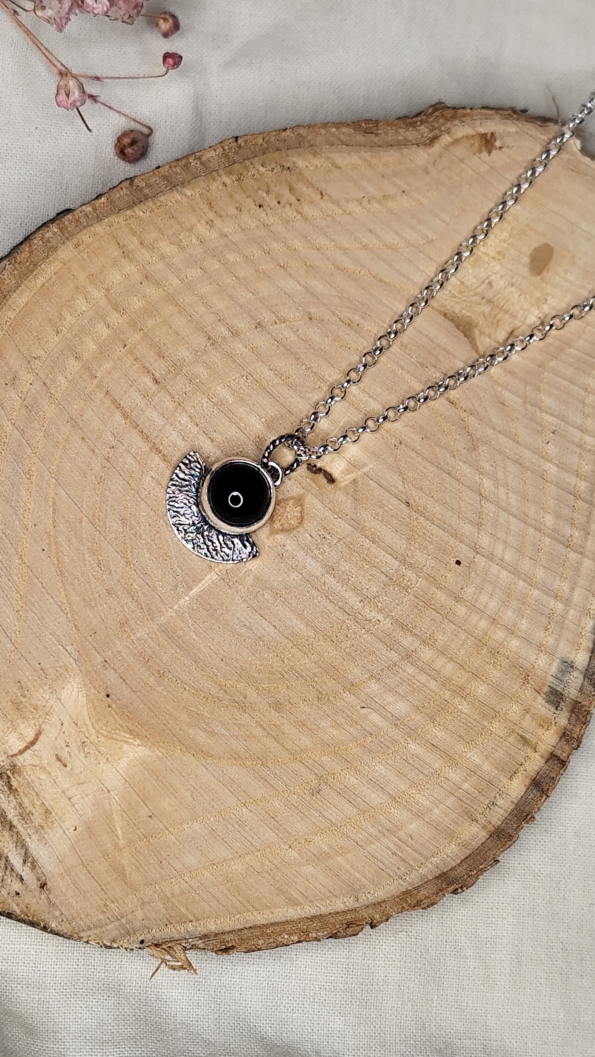 Un medio círculo de plata reciclada , trabajado a fuego para crear una textura orgánica que recuerde a la superficie de una luna ancestral. Cada pieza es única, porque el fuego nunca dibuja dos veces iguales.